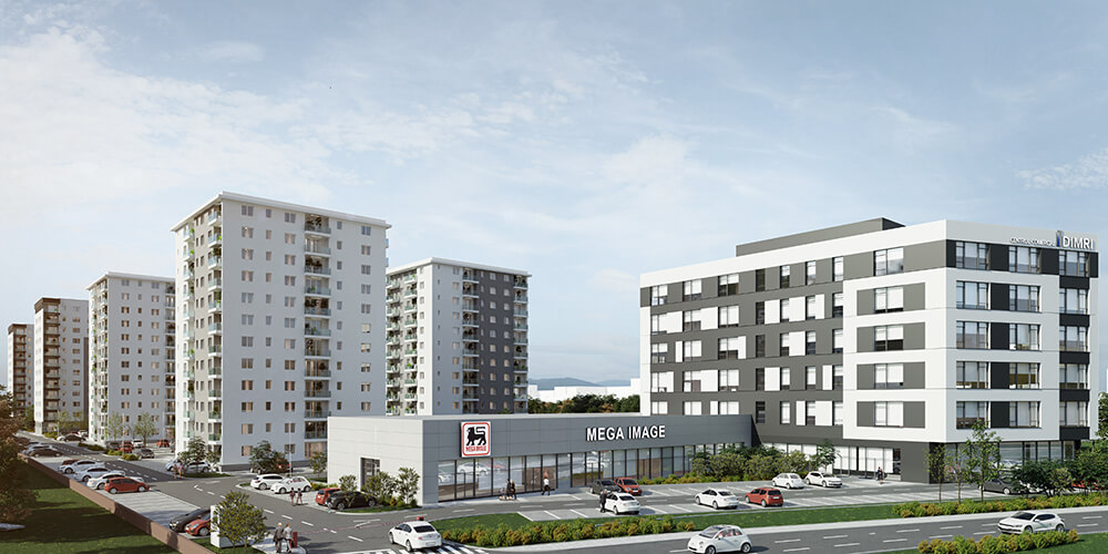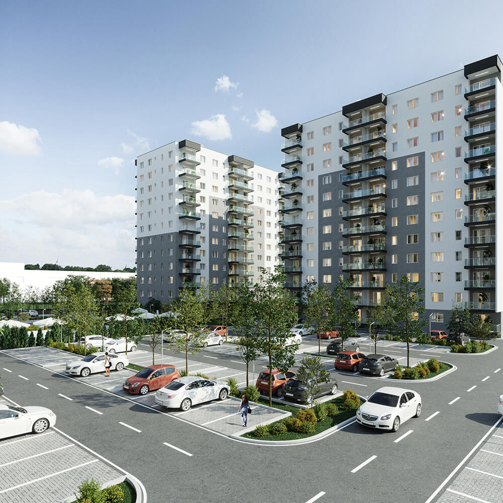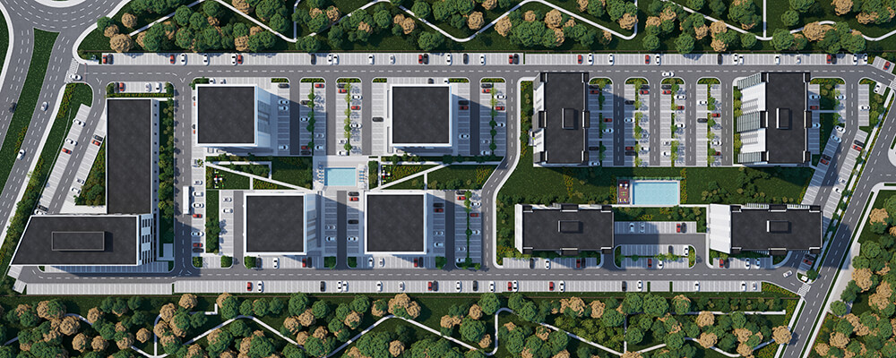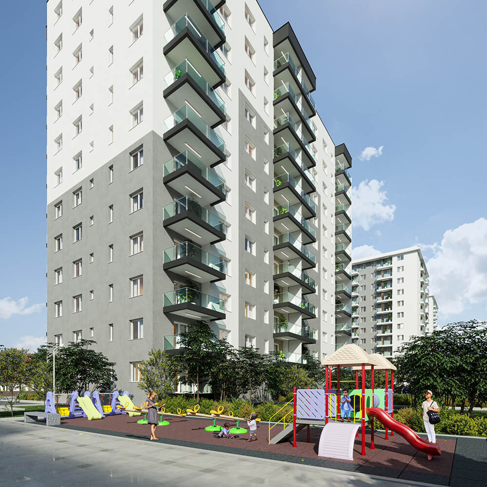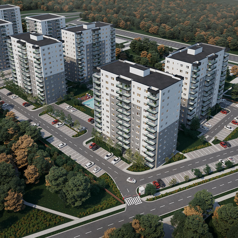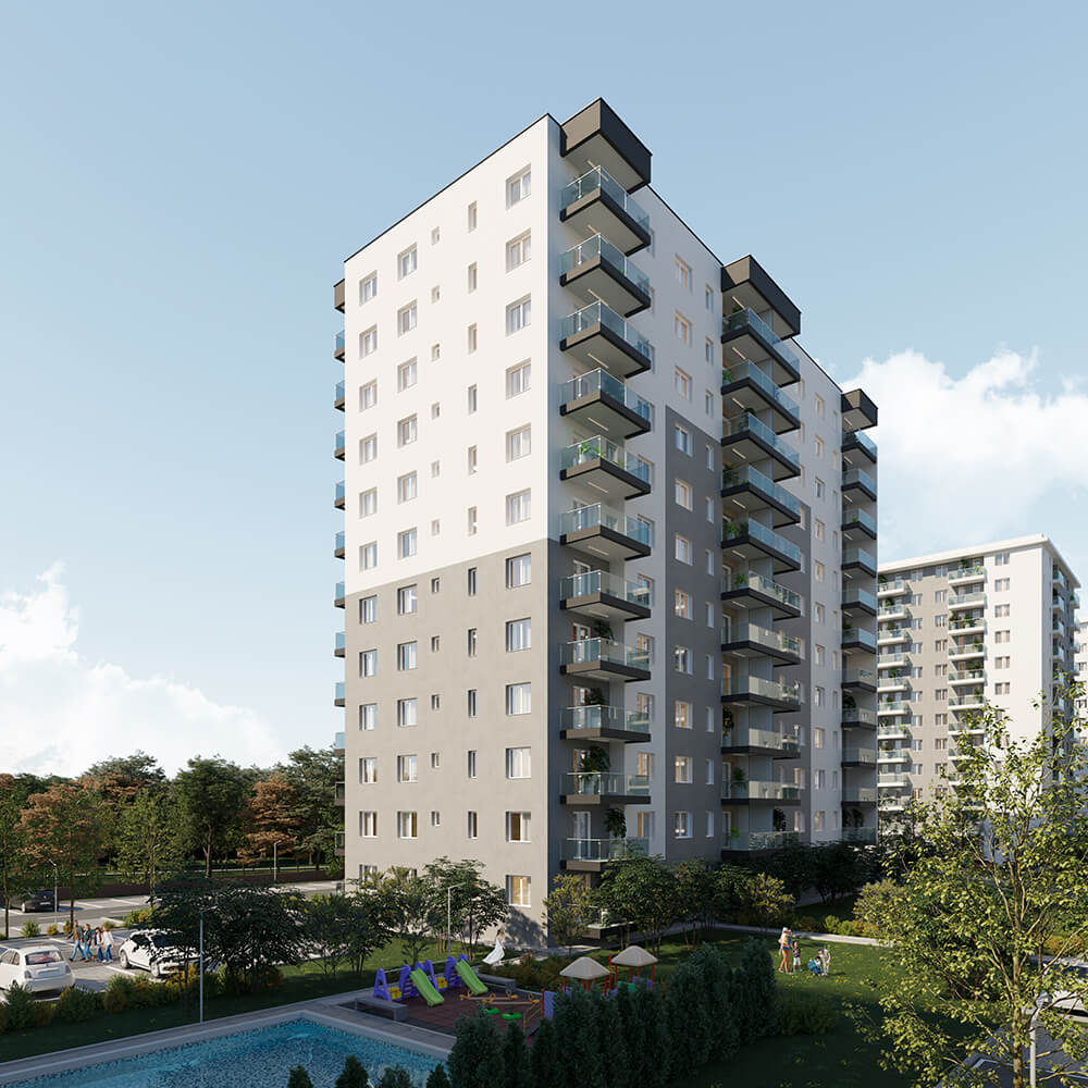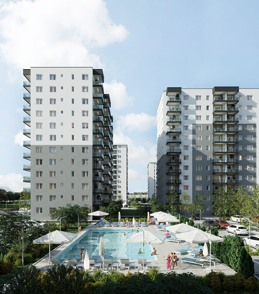 Imaginea de ansamblu a proiectului DIMRI RESIDENCE este o combinație perfectă între designul minimalist și funcționalitatea practică. Fațadele clasice ale clădirilor se contrastează cu piscina și spațiile verzi generoase, oferind un aspect modern și elegant. Putem spune că exteriorul cartierului nostru este o invitație către o viață activă și confortabilă într-un mediu estetic și armonios.
